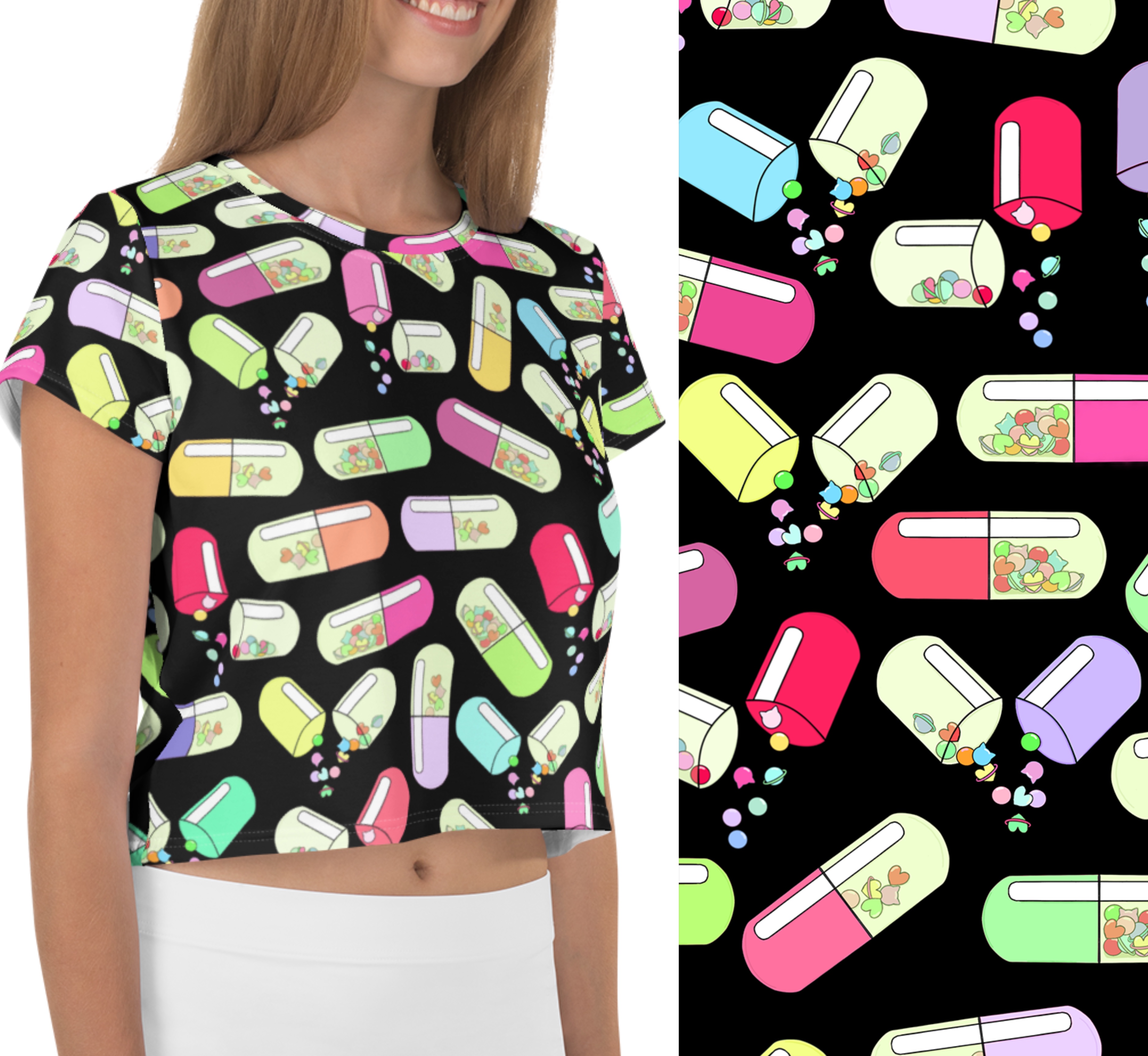 Looking for you next wardrobe favorite? Well, look no further because this crop tee is printed and sewn to fit you just right. To top that off, the original all-over design is definitely worth showing off, so don't hesitate to own one of these tees - they're meant to be adored.